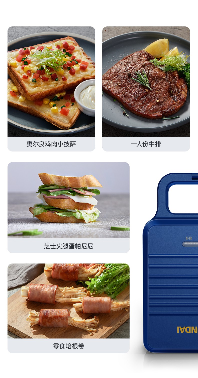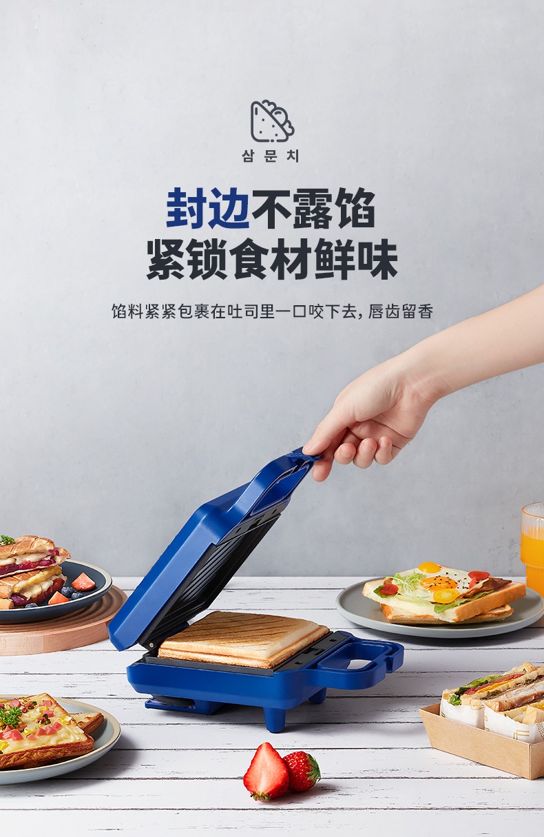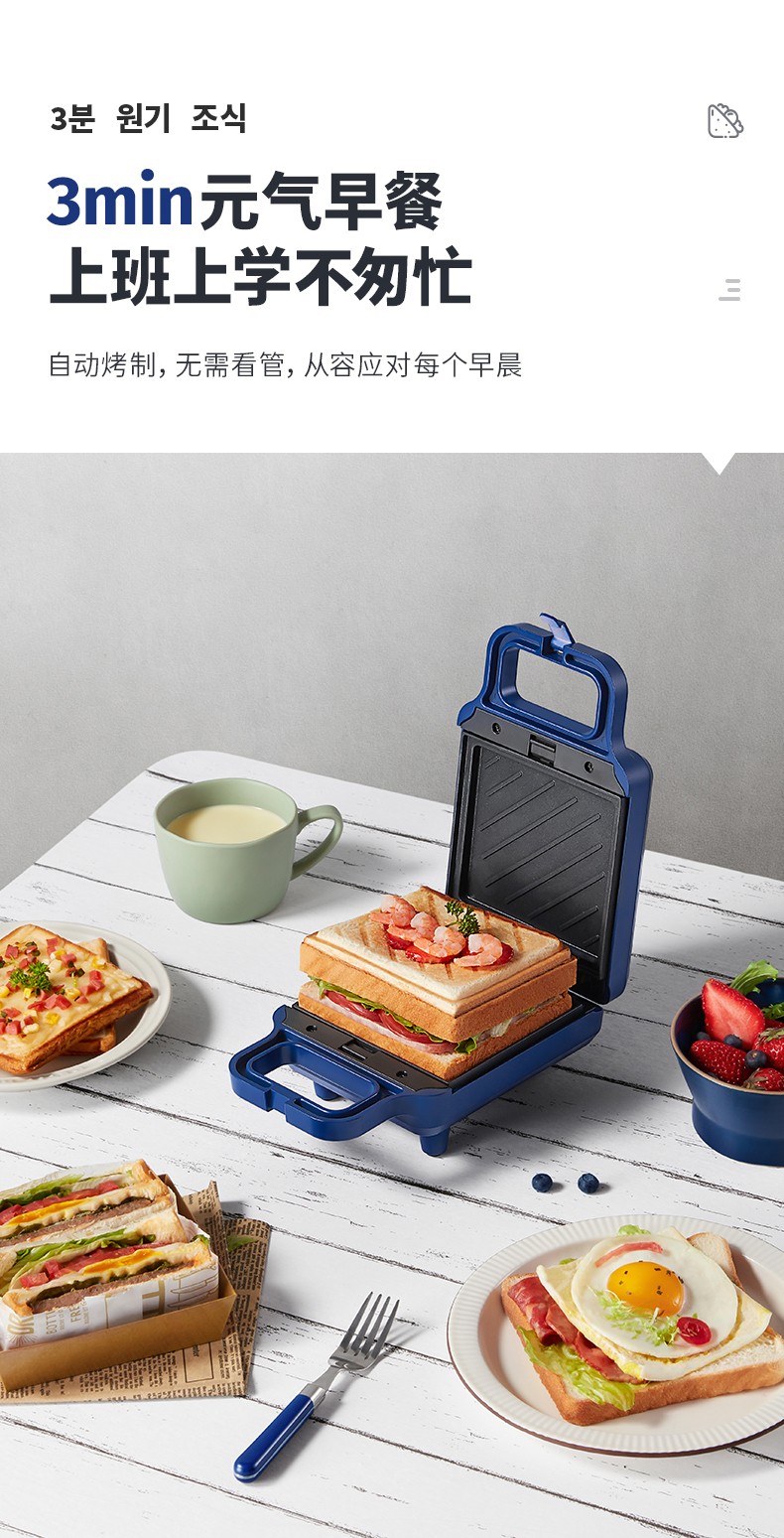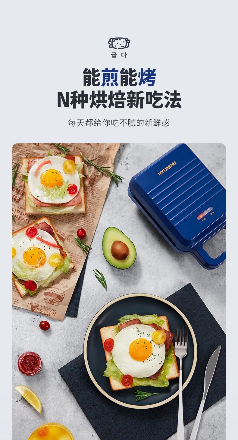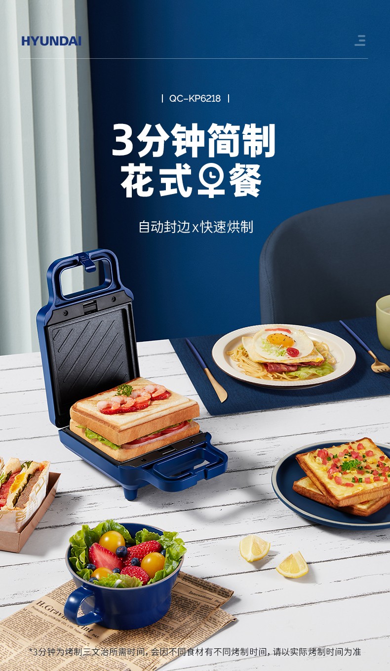 韩国现代(HYUNDAI)QC-KP6218三明治机 早餐机家用电饼铛多功能三文治机机加厚烤盘 深蓝色