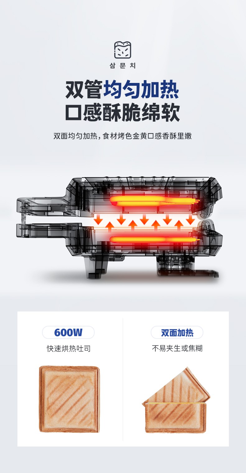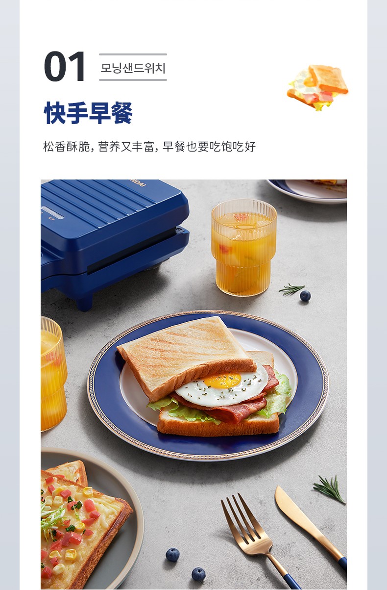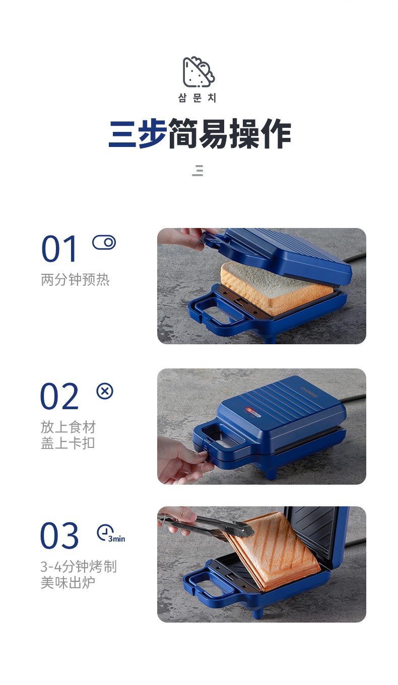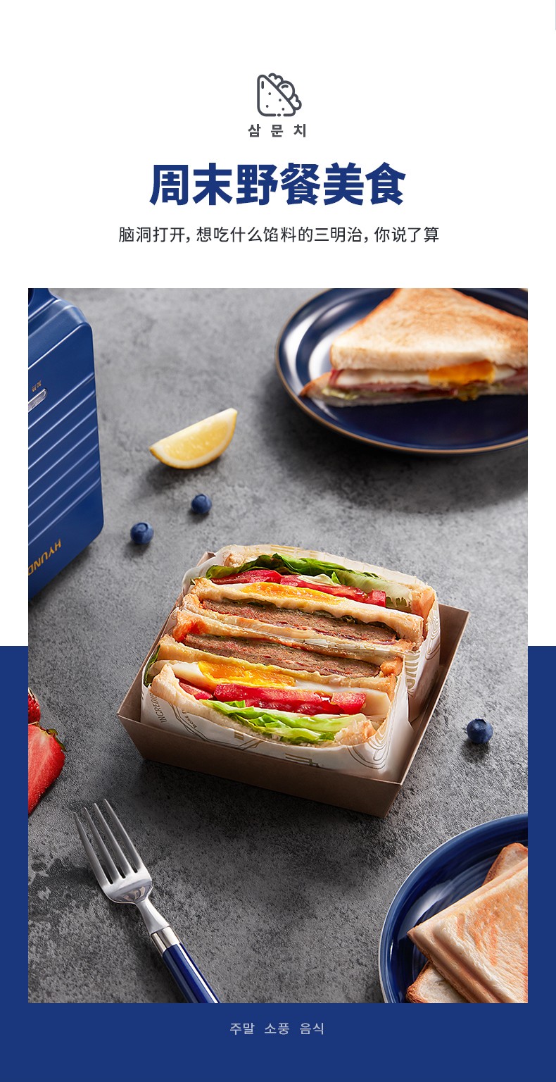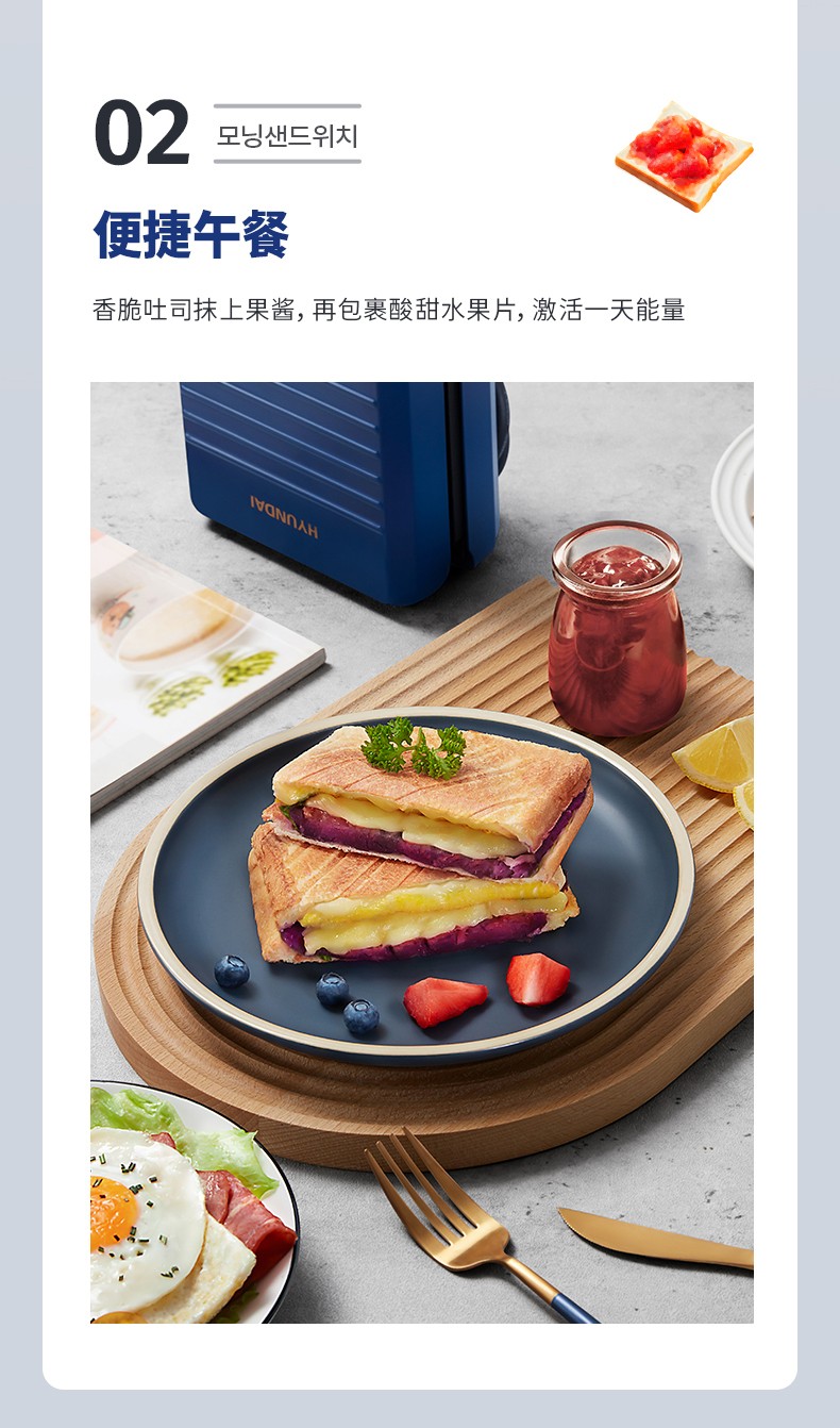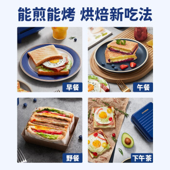 韩国现代(HYUNDAI)QC-KP6218三明治机 早餐机家用电饼铛多功能三文治机机加厚烤盘 深蓝色